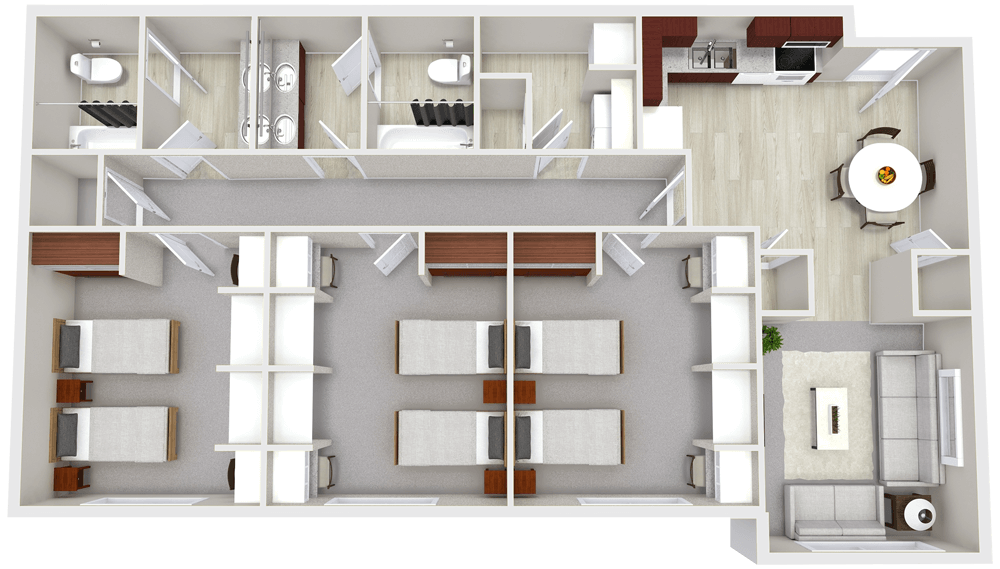 Our classic 3-bed/2-bath layout gives you room to breathe. Fully furnished with everything included — just bring your personal touches and move right in.
